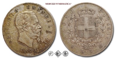 Regno d'Italia, VITTORIO EMANUELE II, LIRE 5 (SCUDO), 1874 M, Zecca di Milano, ARGENTO, BB, (Pagani 498) / monete italiane moderne (moneta italia moderna d'argento - scudi da collezione - Casa Savoia) | Moruzzi Numismatica