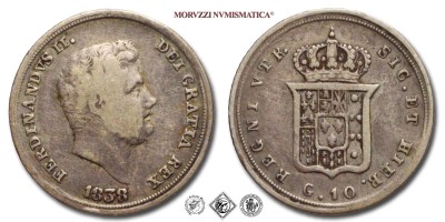 Regno delle due Sicilie, FERDINANDO II DI BORBONE, CARLINO GRANA 10, 1838, Zecca di Napoli, ARGENTO, BB, (RR), (Pannuti-Riccio 152) / monete italiane preunitarie napoletane d'argento (moneta italiana preunitaria napoletana borbonica rara - piastre borboniche rare da collezione) | Moruzzi Numismatica