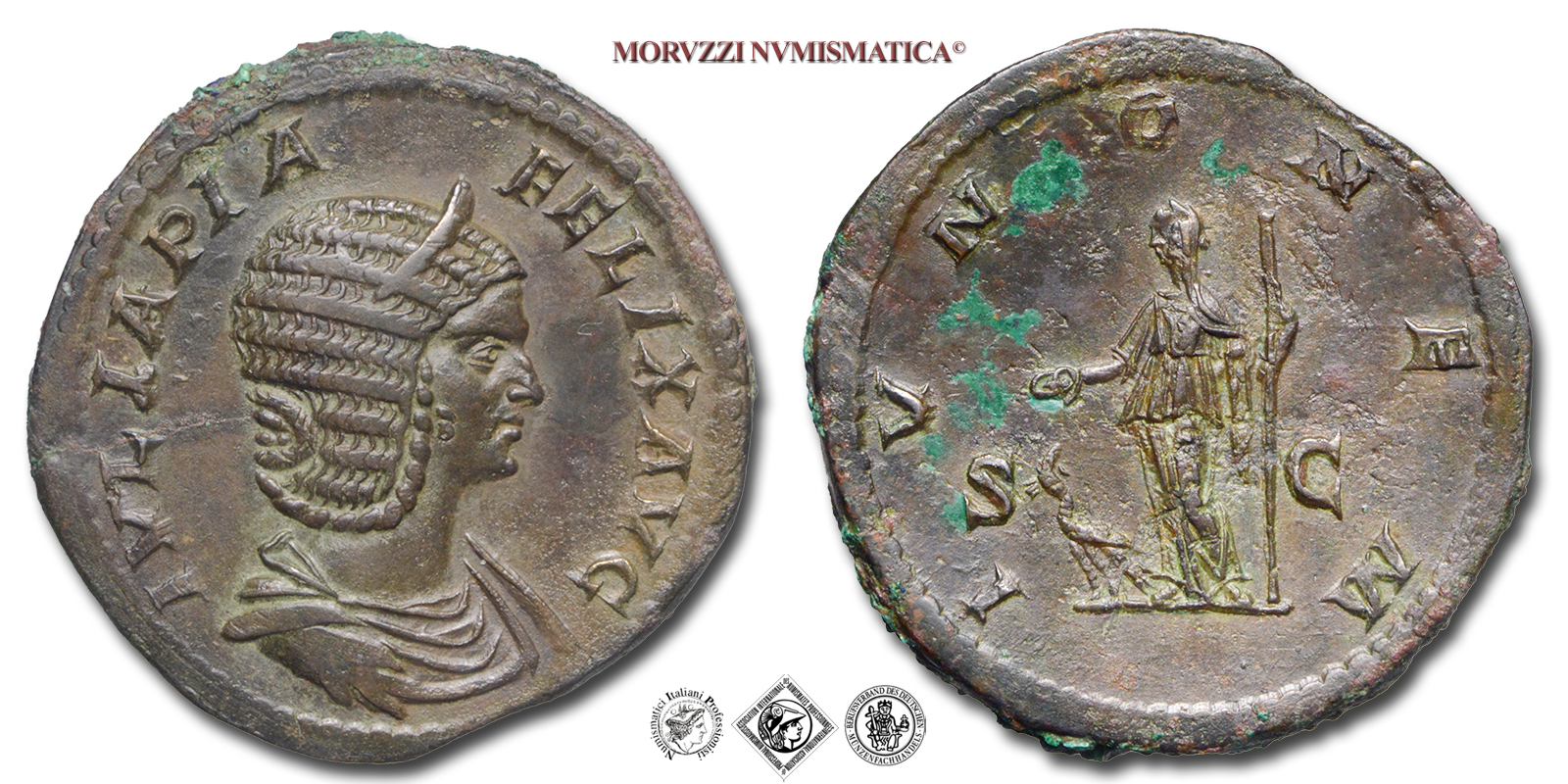 Impero Romano, GIULIA DOMNA, Moglie di Settimio Severo, 193-211 d.C., SESTERZIO, Emissione: 211-217 d.C., D/ IVLIA PIA FELIX AVG, Busto drappeggiato a d., R/ IVNONEM, S C, Giunone velata stante a s. con patera nella d. e scettro nella s. Alla sua d. il pavone, Zecca di Roma, Rif. bibl. R.I.C., 585/S; Cohen, 88/Fr.8; Metallo: AE, gr. 23,61, (MR161566), Diam.: mm. 32,76, SPL, (R)