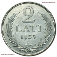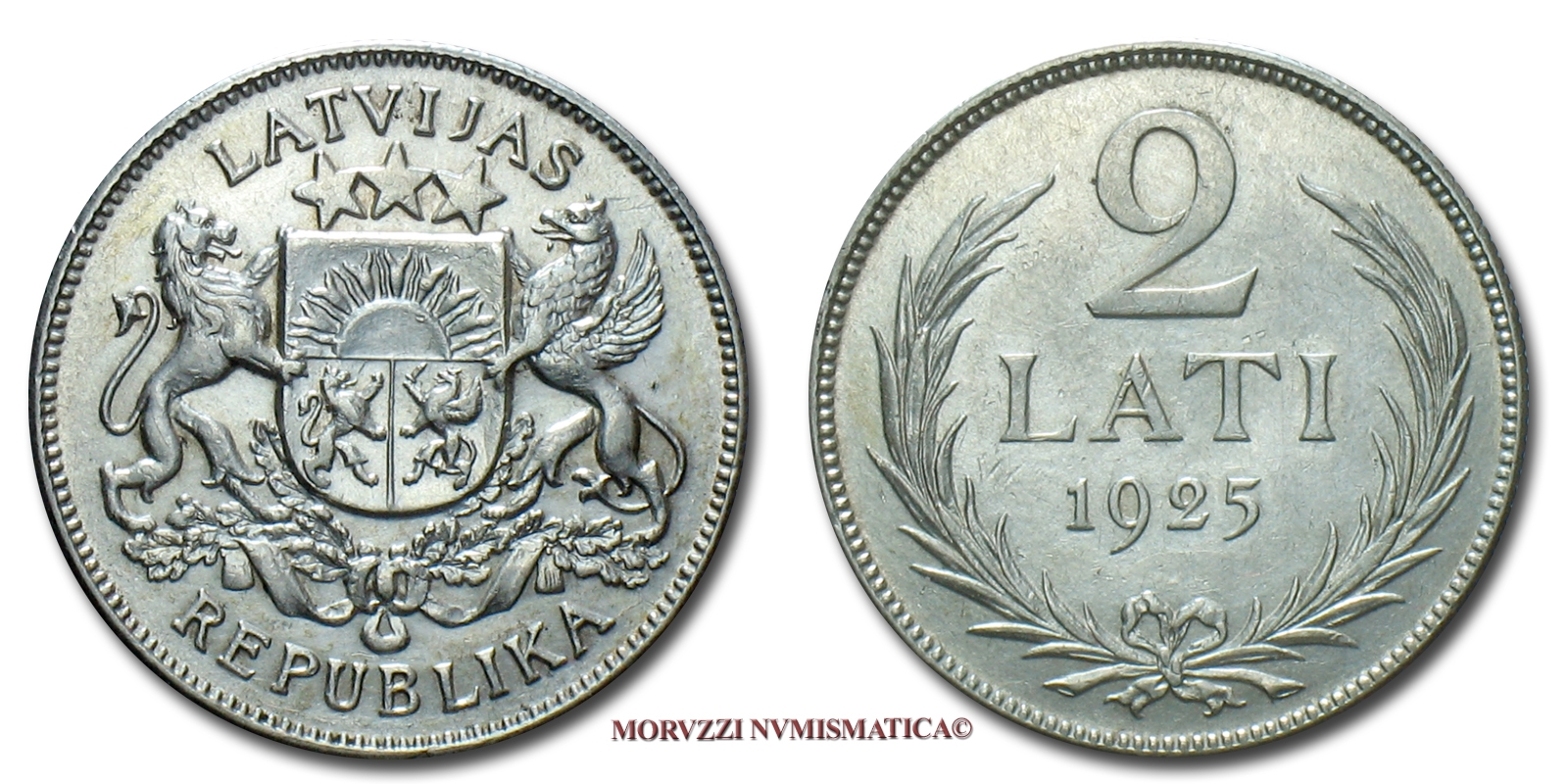 Lettonia, REPUBBLICA, 1918-1939, 2 LATI, Emissione: 1925, D/ LATVIJAS REPUBLIKA, stemma della Lettonia sorretto da un leone e da un grifone; incisore: Jānis Tilbergs, R/ 2 LATI 1925 su tre righe all'interno di una corona; incisore: Jānis Tilbergs, Zecca di Londra (The Royal Mint), Rif. bibl. KM, 8; Schön, 8; Metallo: AR, gr. 10,04, (ME120571), Diam.: mm. 26,96, SPL