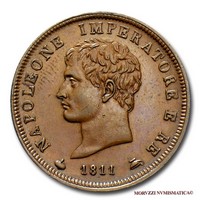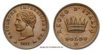 Milano, NAPOLEONE I, Re d'Italia, SOLDO, Emissione: 1811 M, D/ NAPOLEONE IMPERATORE E RE, testa nuda a s.; in basso, nel giro: data (1811) tra il segno di zecca (melagrana) e un lume ad olio, R/ REGNO D'ITALIA, nel campo: corona ferrea radiata (simbolo del Sacro Romano Impero) / SOLDO / lettera identificativa di zecca (M), Zecca di Milano, Rif. bibl. Pagani, 76; Metallo: CU, gr. 10,12, (MZ71963), Diam.: mm. 27,25, mSPL
