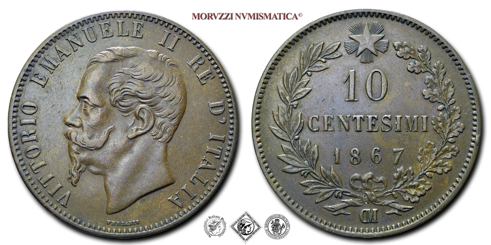 Regno d'Italia, VITTORIO EMANUELE II, 1861-1878, CENTESIMI 10, Emissione: 1867 OM, D/ VITTORIO EMANUELE II RE D'ITALIA, Testa nuda del Re a sinistra. Sotto il collo: il nome dell'autore (FERRARIS), R/ Valore (10 CENTESIMI) e millesimo (1867) su tre righe contornato da rami di alloro e di rovere, in alto la stella Italiana e in basso il segno di zecca (OM), Zecca di Strasburgo, Rif. bibl. Pagani, 550; Metallo: CU, gr. 10,02, (MI154699), Diam.: mm. 30,16, mBB, (R)