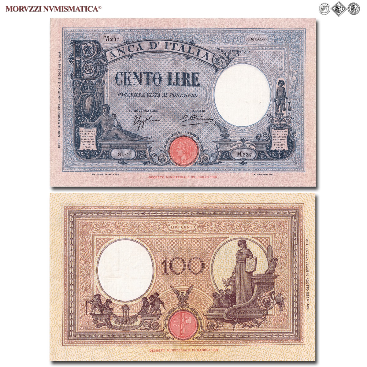 Italia, Vittorio Emanuele III, BANCA D'ITALIA, 100 LIRE, Barbetti - azzurrino / fascio (contrassegno di Stato: Testina d'Italia), 16.05.1932, D/ nella sinistra grande "B" sorretta da due putti tra i quali vi è uno scudo sabaudo coronato con il collare della SS. Annunziata; figura femminile seduta, rappresentante il Sapere; nella destra genio allegorico della Giustizia con bilancia e spada, R/ nella destra figura femminile personificante la Scienza, con fiaccola e libro delle umane conoscenze, contornata da putti; piccola aquila nel centro e sulla sinistra putti che tirano una rete, Rif. bibl. Crapanzano, 216; (CM67058), Firme: Azzolini, Cima, n° di serie: M237 8504, SPL, (R)