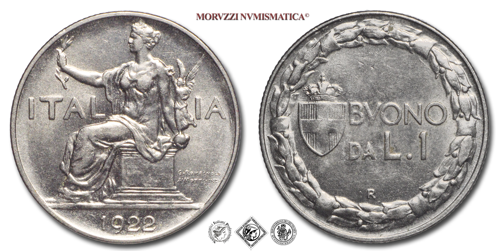 Regno d'Italia, VITTORIO EMANUELE III, BUONO DA 1 LIRA, Italia seduta, 1922, Zecca di Roma, NICHEL, FDC, (Pagani 776) / monete italiane moderne (moneta italiana moderna da collezione - Casa Savoia)