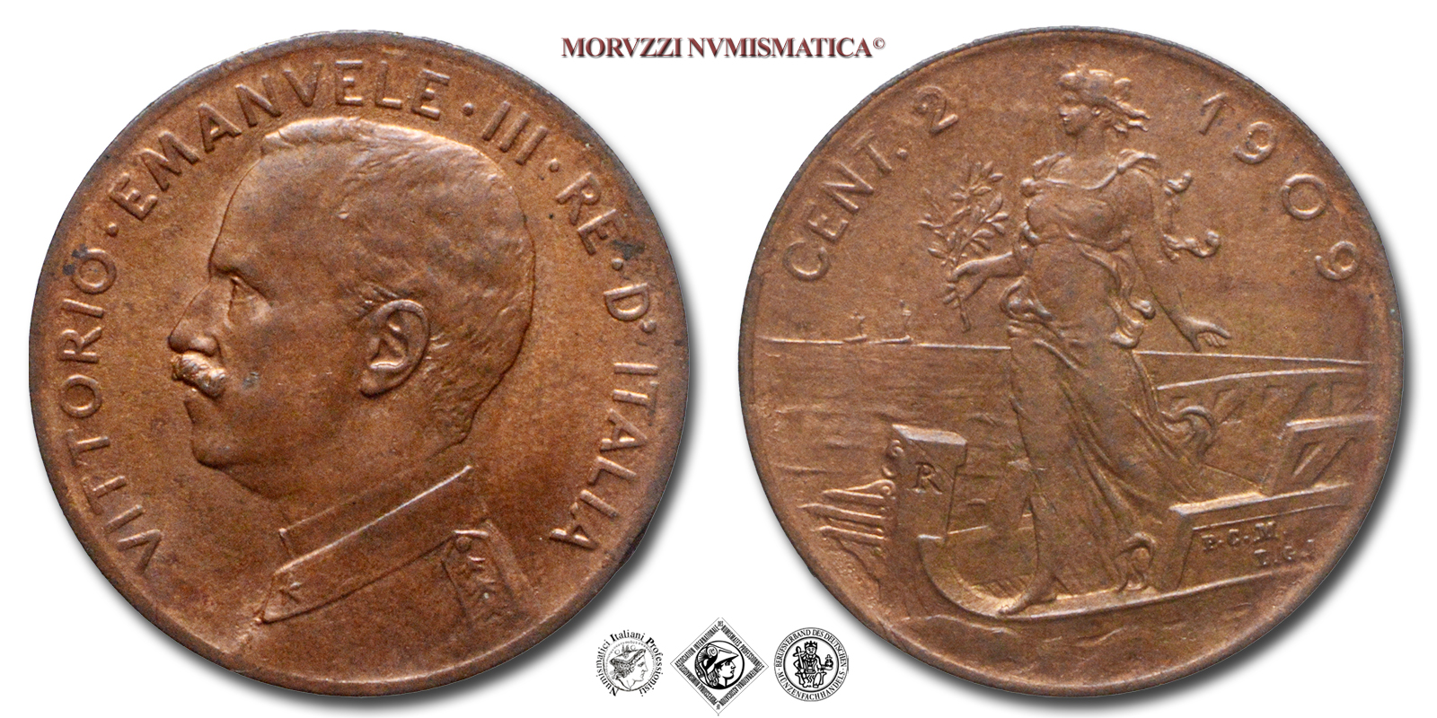 Regno d'Italia, VITTORIO EMANUELE III, CENTESIMI 2, Italia su prora, 1909, Zecca di Roma, RAME, FDC, (Pagani 932) / monete italiane moderne (moneta italiana moderna da collezione - Casa Savoia)