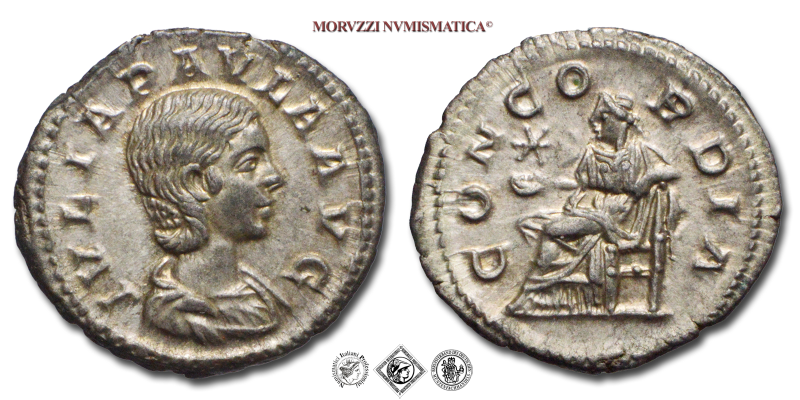 Impero Romano, GIULIA PAOLA, Moglie di Elagabalo, 218-222 d.C., DENARIO, Emissione: 219-220 d.C., D/ IVLIA PAVLA AVG, busto ammantato a destra, R/ CONCORDIA, la Concordia seduta a sinistra con patera nella destra e scettro nella sinistra; nel campo a sinistra una stella, Zecca di Roma, Rif. bibl. R.I.C., 211/S; Cohen, 6/Fr. 6; Metallo: AR, gr. 3,66, (MR163164), Diam.: mm. 20,38, FDC, (R)