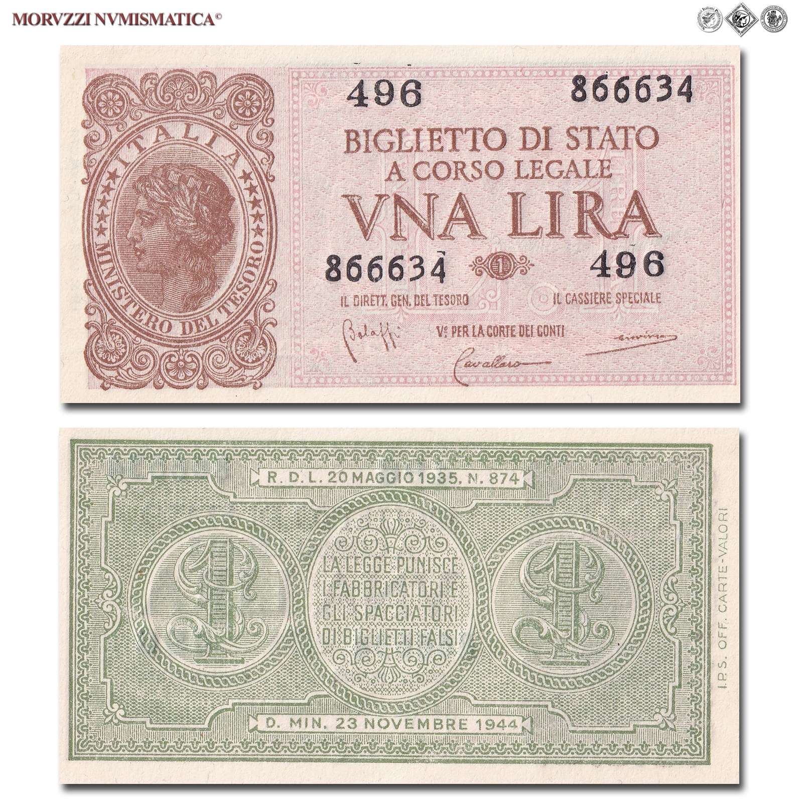 Italia, Luogotenenza, BIGLIETTO DI STATO, 1 LIRA, 23.11.1944, D/ raffigurazione dell'Italia laureata rivolta verso sinistra, R/ l'ovale reca la frase La legge punisce i fabbricatori e gli spacciatori di biglietti falsi, Rif. bibl. Crapanzano, BS8; (CM155917), Firme: Bolaffi, Cavallaro, Giovinco, di serie: 496 866634, FDS