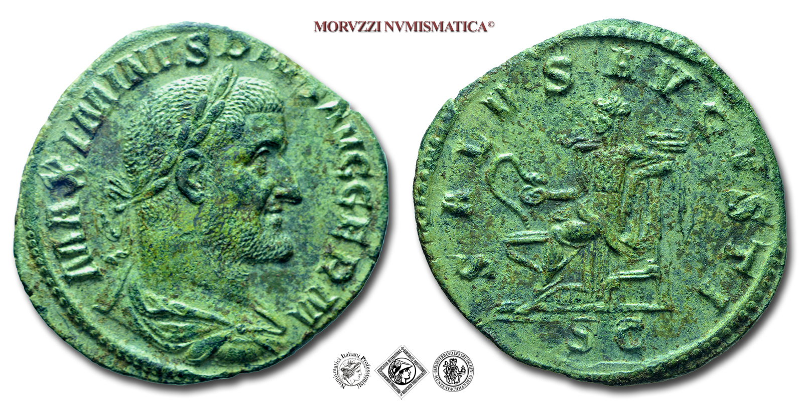 Impero Romano, MASSIMINO I IL TRACE, 235-238 d.C., SESTERZIO, Emissione: 236-238 d.C., D/ MAXIMINVS PIVS AVG GERM, busto laureato con corazza e paludamento a destra, R/ SALVS AVGVSTI / S C, la Salus seduta a sinistra con una patera nella destra nutre un serpente che si slancia da un altare, Zecca di Roma, Rif. bibl. R.I.C., 85; Cohen, 92; Metallo: AE, gr. 17,52, (MR153532), Diam.: mm. 30,42, mSPL