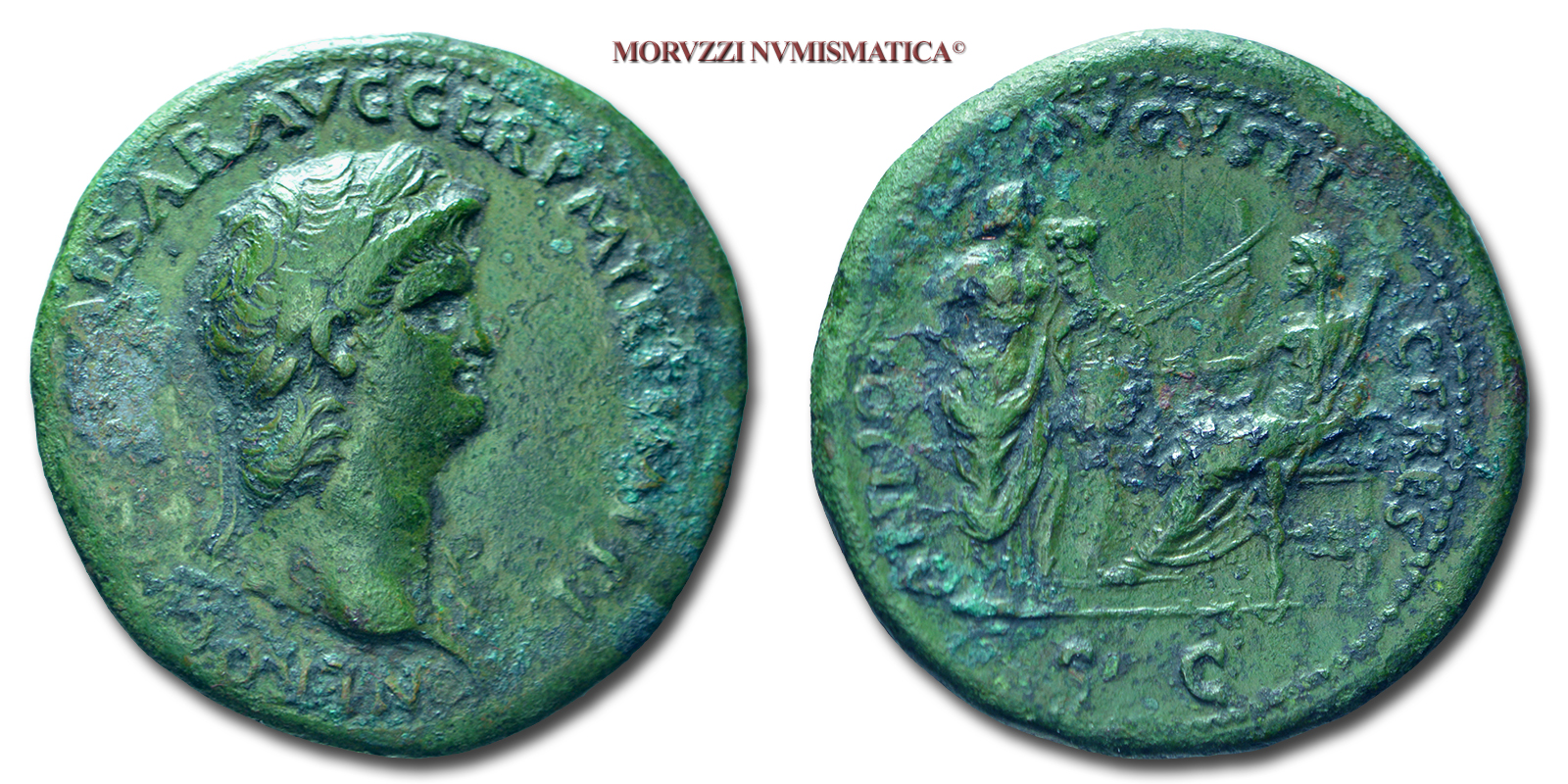 Impero Romano, NERONE, 54-68 d.C., SESTERZIO, Emissione: 64 d.C., D/ NERO CLAVD CAESAR AVG GER P M TR P IMP P P, testa laureata a destra con egida, R/ ANNONA AVGVSTI CERES / S C, Cerere velata seduta a sinistra con spighe di grano e torcia di fronte all'Annona con cornucopia. Tra di loro un modio su altare con ghirlande, Zecca di Roma, Rif. bibl. R.I.C., 137; Cohen, 14; Cayon, 30; Metallo: AE, gr. 26,61, (MR153932), Diam.: mm. 34,35, BB