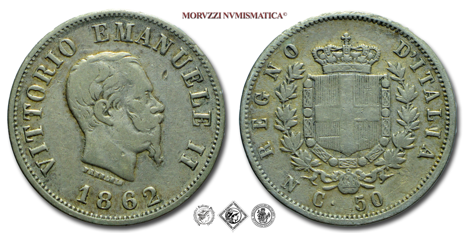 Regno d'Italia, VITTORIO EMANUELE II, 1861-1878, 50 CENTESIMI, Stemma sabaudo, Emissione: 1862 N, D/ Testa nuda del Re a destra, attorno VITTORIO EMANUELE II e il millesimo (1862); nome dell'autore sotto il collo: FERRARIS •, R/ Stemma del casato Savoia tra rami di alloro, intorno: REGNO D'ITALIA, in basso il valore (C. 50) e il segno di zecca (N e le lettere BN in incuso in un rettangolo), Zecca di Napoli, Rif. bibl. Pagani, 523; Metallo: AR, gr. 2,46, (MI94242), Diam.: mm. 18,14, qBB, (R)