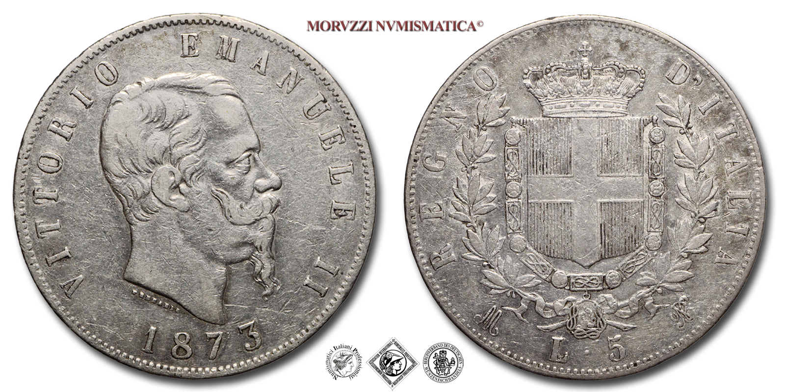 Regno d'Italia, VITTORIO EMANUELE II, 1861-1878, LIRE 5, Emissione: 1873 M, D/ VITTORIO EMANUELE II, testa nuda del Re a d.; lungo il taglio del collo: indicazione dell'autore (FERRARIS); sotto: il millesimo (1873), R/ stemma del casato Savoia con il collare dell'Annunziata sormontato da corona reale e circondato da due rami di lauro; sotto: il segno di zecca (M), il valore nominale (L • 5) e il monogramma (BN), Zecca di Milano, Rif. bibl. Pagani, 496; Metallo: AR, gr. 24,94, (MI111216), Diam.: mm. 37,03, mBB