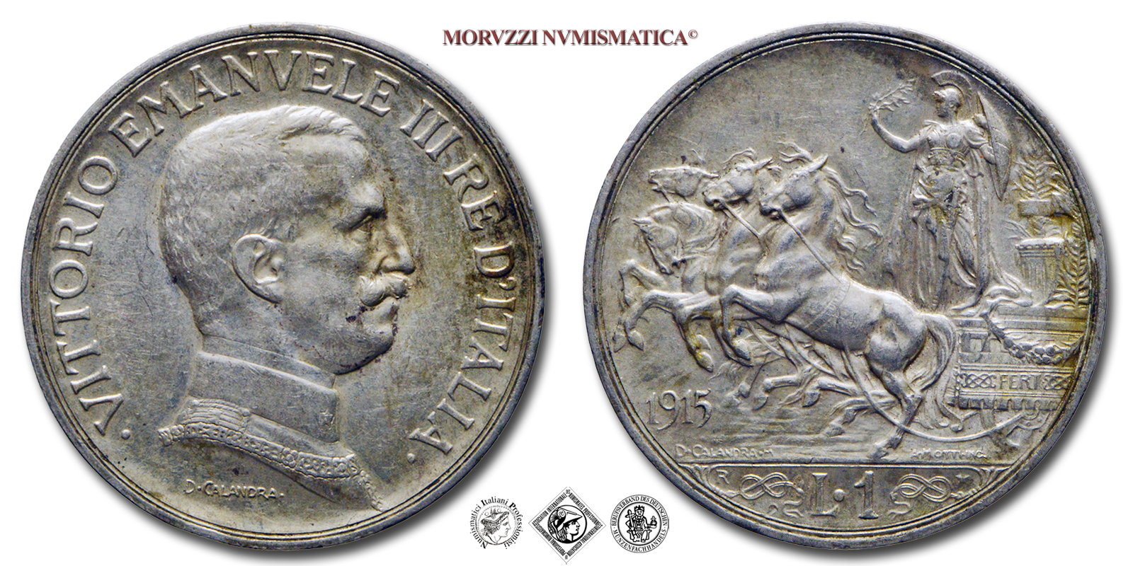 Regno d'Italia, VITTORIO EMANUELE III, 1900-12943, 1 LIRA, Quadriga briosa, Emissione: 1915, D/ • VITTORIO • EMANUELE • III • RE • D'ITALIA •, busto in uniforme e con il collare dell'Annunziata del Re a d.; sotto: indicazione del nome dell'autore (D • CALANDRA •), R/ figura allegorica dell'Italia con scudo, elmo e ramo di quercia posta su di un carro trainato da quattro cavalli. Il carro è adorno di festoni, di nodi savoia e presenta il motto FERT; sotto le zampe anteriori dei cavalli: indicazione del millesimo (1915) ; in esergo: indicazione del nominale (L • 1) tra due nodi savoia; sopra il nodo di s.: il segno di zecca (R); sopra il nodo di d.: una stella a cinque punte; sulla linea dell'esergo: a s. il nome dell'autore (D • CALANDRA • M), a d. il nome dell'incisore (A • MOTTI INC •), Zecca di Roma, Rif. bibl. Pagani, 773; Metallo: AR, gr. 4,97, (MI95550), Diam.: mm. 23,00, qSPL