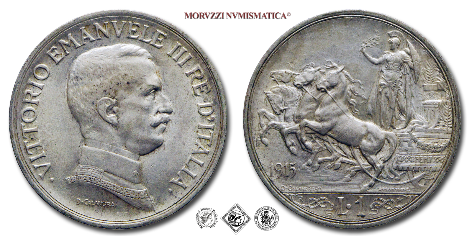 Regno d'Italia, VITTORIO EMANUELE III, 1900-12943, 1 LIRA, Quadriga briosa, Emissione: 1915, D/ • VITTORIO • EMANUELE • III • RE • D'ITALIA •, busto in uniforme e con il collare dell'Annunziata del Re a d.; sotto: indicazione del nome dell'autore (D • CALANDRA •), R/ figura allegorica dell'Italia con scudo, elmo e ramo di quercia posta su di un carro trainato da quattro cavalli. Il carro è adorno di festoni, di nodi savoia e presenta il motto FERT; sotto le zampe anteriori dei cavalli: indicazione del millesimo (1915) ; in esergo: indicazione del nominale (L • 1) tra due nodi savoia; sopra il nodo di s.: il segno di zecca (R); sopra il nodo di d.: una stella a cinque punte; sulla linea dell'esergo: a s. il nome dell'autore (D • CALANDRA • M), a d. il nome dell'incisore (A • MOTTI INC •), Zecca di Roma, Rif. bibl. Pagani, 773; Metallo: AR, gr. 4,98, (MI95553), Diam.: mm. 23,00, mBB