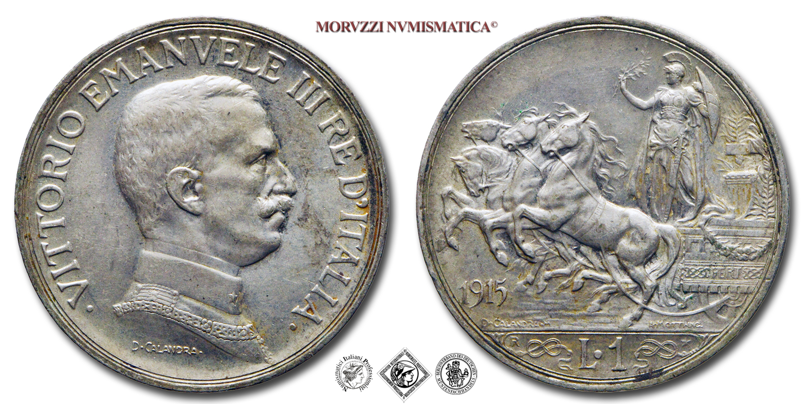 Regno d'Italia, VITTORIO EMANUELE III, 1900-12943, 1 LIRA, Quadriga briosa, Emissione: 1915, D/ • VITTORIO • EMANUELE • III • RE • D'ITALIA •, busto in uniforme e con il collare dell'Annunziata del Re a d.; sotto: indicazione del nome dell'autore (D • CALANDRA •), R/ figura allegorica dell'Italia con scudo, elmo e ramo di quercia posta su di un carro trainato da quattro cavalli. Il carro è adorno di festoni, di nodi savoia e presenta il motto FERT; sotto le zampe anteriori dei cavalli: indicazione del millesimo (1915) ; in esergo: indicazione del nominale (L • 1) tra due nodi savoia; sopra il nodo di s.: il segno di zecca (R); sopra il nodo di d.: una stella a cinque punte; sulla linea dell'esergo: a s. il nome dell'autore (D • CALANDRA • M), a d. il nome dell'incisore (A • MOTTI INC •), Zecca di Roma, Rif. bibl. Pagani, 773; Metallo: AR, gr. 5,00, (MI127021), Diam.: mm. 23,00, qSPL