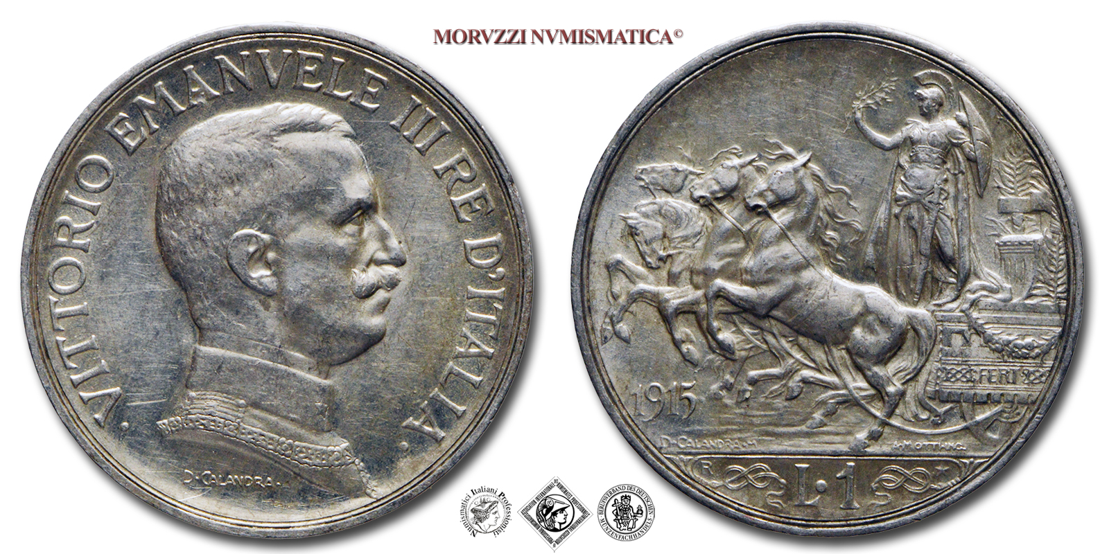 Regno d'Italia, VITTORIO EMANUELE III, 1900-12943, 1 LIRA, Quadriga briosa, Emissione: 1915, D/ • VITTORIO • EMANUELE • III • RE • D'ITALIA •, busto in uniforme e con il collare dell'Annunziata del Re a d.; sotto: indicazione del nome dell'autore (D • CALANDRA •), R/ figura allegorica dell'Italia con scudo, elmo e ramo di quercia posta su di un carro trainato da quattro cavalli. Il carro è adorno di festoni, di nodi savoia e presenta il motto FERT; sotto le zampe anteriori dei cavalli: indicazione del millesimo (1915) ; in esergo: indicazione del nominale (L • 1) tra due nodi savoia; sopra il nodo di s.: il segno di zecca (R); sopra il nodo di d.: una stella a cinque punte; sulla linea dell'esergo: a s. il nome dell'autore (D • CALANDRA • M), a d. il nome dell'incisore (A • MOTTI INC •), Zecca di Roma, Rif. bibl. Pagani, 773; Metallo: AR, gr. 4,98, (MI95563), Diam.: mm. 23,18, qSPL