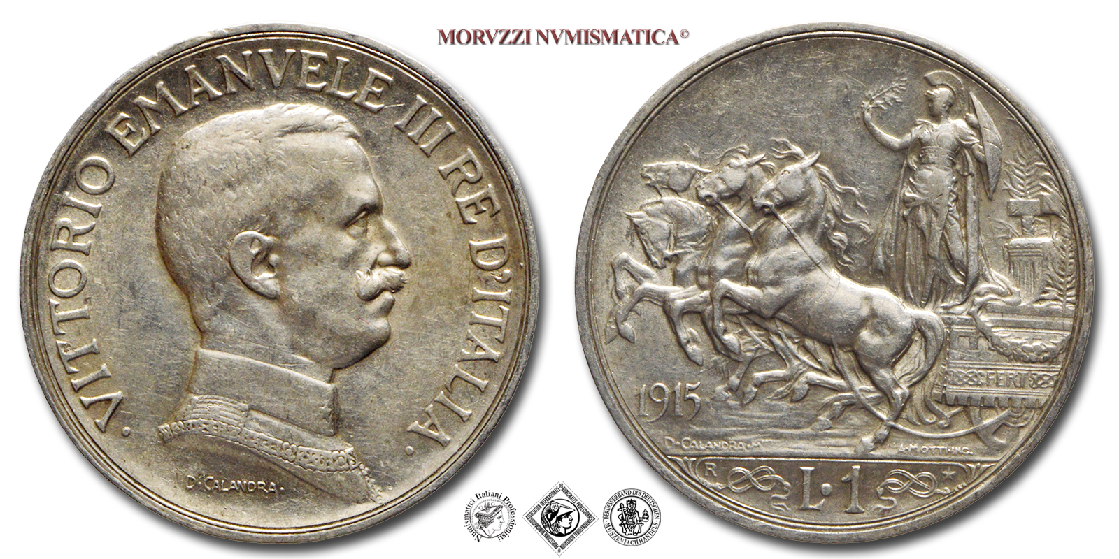 Regno d'Italia, VITTORIO EMANUELE III, 1900-12943, 1 LIRA, Quadriga briosa, Emissione: 1915, D/ • VITTORIO • EMANUELE • III • RE • D'ITALIA •, busto in uniforme e con il collare dell'Annunziata del Re a d.; sotto: indicazione del nome dell'autore (D • CALANDRA •), R/ figura allegorica dell'Italia con scudo, elmo e ramo di quercia posta su di un carro trainato da quattro cavalli. Il carro è adorno di festoni, di nodi savoia e presenta il motto FERT; sotto le zampe anteriori dei cavalli: indicazione del millesimo (1915) ; in esergo: indicazione del nominale (L • 1) tra due nodi savoia; sopra il nodo di s.: il segno di zecca (R); sopra il nodo di d.: una stella a cinque punte; sulla linea dell'esergo: a s. il nome dell'autore (D • CALANDRA • M), a d. il nome dell'incisore (A • MOTTI INC •), Zecca di Roma, Rif. bibl. Pagani, 773; Metallo: AR, gr. 4,98, (MI95565), Diam.: mm. 23,14, mBB