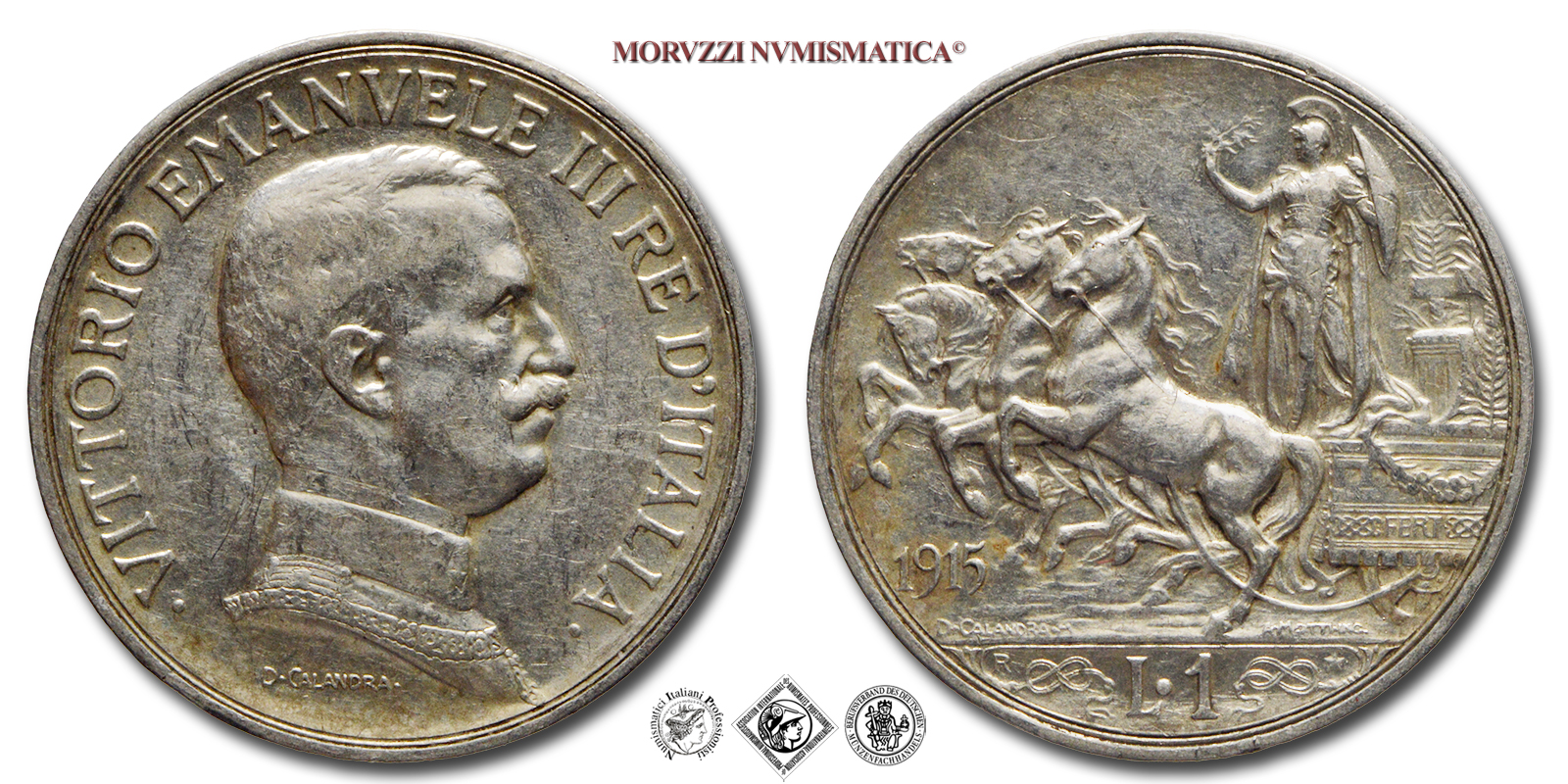 Regno d'Italia, VITTORIO EMANUELE III, 1900-12943, 1 LIRA, Quadriga briosa, Emissione: 1915, D/ • VITTORIO • EMANUELE • III • RE • D'ITALIA •, busto in uniforme e con il collare dell'Annunziata del Re a d.; sotto: indicazione del nome dell'autore (D • CALANDRA •), R/ figura allegorica dell'Italia con scudo, elmo e ramo di quercia posta su di un carro trainato da quattro cavalli. Il carro è adorno di festoni, di nodi savoia e presenta il motto FERT; sotto le zampe anteriori dei cavalli: indicazione del millesimo (1915) ; in esergo: indicazione del nominale (L • 1) tra due nodi savoia; sopra il nodo di s.: il segno di zecca (R); sopra il nodo di d.: una stella a cinque punte; sulla linea dell'esergo: a s. il nome dell'autore (D • CALANDRA • M), a d. il nome dell'incisore (A • MOTTI INC •), Zecca di Roma, Rif. bibl. Pagani, 773; Metallo: AR, gr. 4,98, (MI95567), Diam.: mm. 23,19, mBB