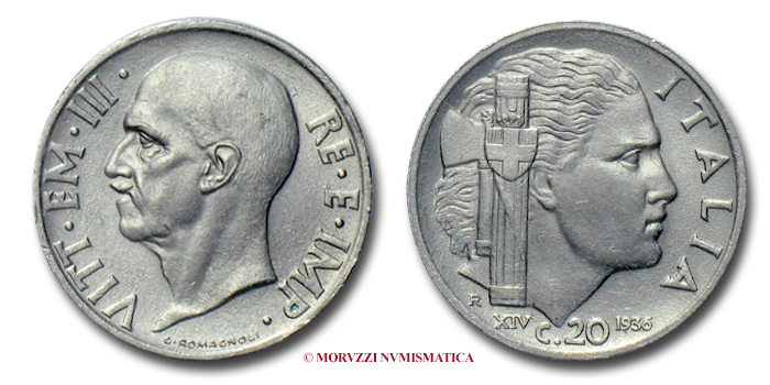 Regno d'Italia, VITTORIO EMANUELE III, 1900-1943, CENTESIMI 20, Impero, Emissione: 1936, Zecca di Roma, Rif. bibl. Pagani, 853; gr. 3,98, (MI122586), Diam.: mm. 21,64, mSPL, (R)