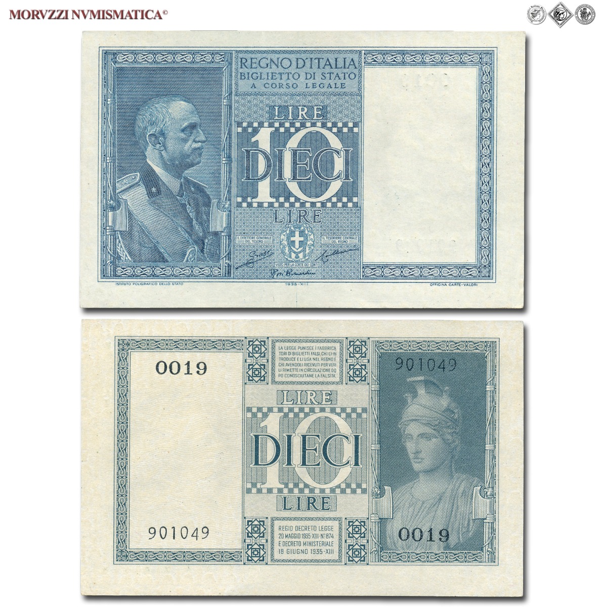Regno d'Italia, Vittorio Emanuele III, BIGLIETTO DI STATO, 10 LIRE, Impero, 1935 XIII, D/ busto di Vittorio Emanuele III in divisa militare tra due fasci littori. Stemma dello stato, R/ sulla destra busto della dea Atena, Rif. bibl. Crapanzano, BS43; (CM152940), Firme: Grassi, Collari, Rosi Bernardini, n° di serie: 0019 901049, mSPL