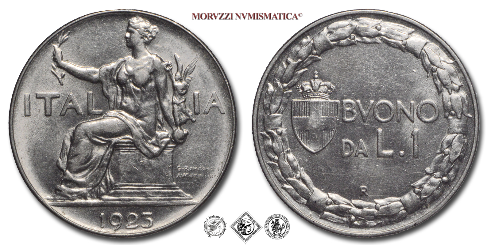 Regno d'Italia, VITTORIO EMANUELE III, 1900-1943, BUONO da 1 LIRA, Italia seduta, Emissione: 1923, D/ Figura allegorica simboleggiante l'Italia seduta su di un piedistallo e volta verso sinistra che regge con la destra un ramoscello di ulivo e con la sinistra una Vittoria alata. Sullo sfondo in orizzontale la scritta ITALIA. A destra del piedistallo i nomi degli autori G • ROMAGNOLI e A • MOTTI INC • su due righe. In esergo il millesimo (1923), R/ Indicazione del valore (BUONO DA L • 1) su due righe affiancata dallo stemma Sabaudo con corona Reale. Lungo il bordo corona di alloro posta in senso orario, Zecca di Roma, Rif. bibl. Pagani, 777; Metallo: NI, gr. 8,07, (MI126673), Diam.: mm. 26,63, FDC