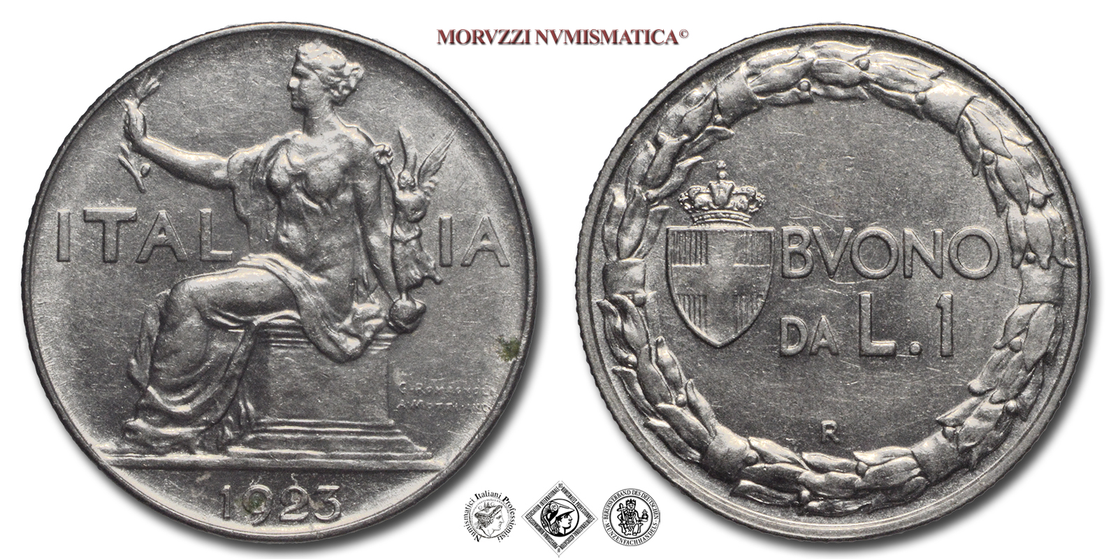Regno d'Italia, VITTORIO EMANUELE III, BUONO da 1 LIRA, Italia seduta, 1923, Zecca di Roma, NICHEL, qSPL, (Pagani 777) / monete italiane moderne (moneta italiana moderna da collezione - Casa Savoia)