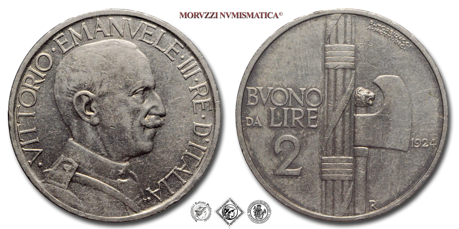 Regno d'Italia, VITTORIO EMANUELE III, 1900-1943, BUONO DA LIRE 2, Fascio, Emissione: 1924, D/ • VITTORIO • EMANUELE • III • RE • D'ITALIA •, semibusto del Re in uniforme a d., R/ Fascio littorio con scure a destra. A sinistra su tre righe BUONO DA LIRE 2; a destra la data (1924). In basso sul lato destro del manico della scure il segno di zecca (R). A ore 1 sul bordo i nomi dell'incisore (A • MOTTI INC.) e dell'autore (P • MORBIDUCCI), Zecca di Roma, Rif. bibl. Pagani, 742; Metallo: NI, gr. 10,10, (MI126693), Diam.: mm. 28,99, qSPL