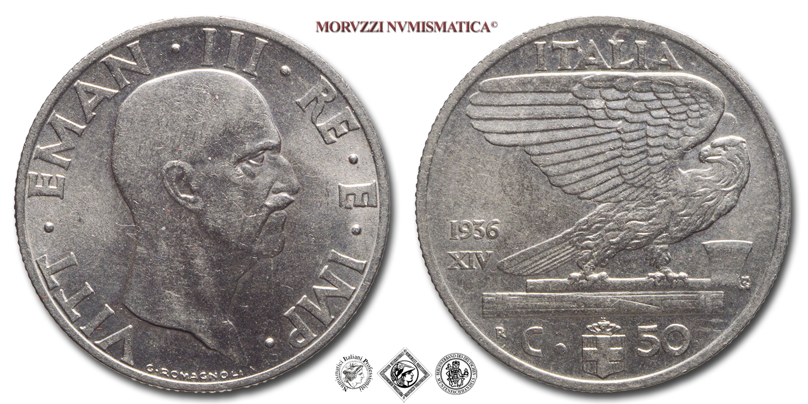 Regno d'Italia, VITTORIO EMANUELE III, 1900-1943, CENTESIMI 50, Emissione: 1936 A XIV, D/ VITT • EMAN • III • RE • E • IMP •, Testa nuda del Re a destra; in basso, lungo il bordo: G • ROMAGNOLI, R/ Vista laterale di un'aquila con ali spiegate che ghermisce un fascio, sopra ITALIA, a sinistra millesimo (1936) e anno dell'Era Fascista (XIV). In basso stemma sabaudo tra il valore (C • 50) con a sinistra il segno di zecca (R), Zecca di Roma, Rif. bibl. Pagani, 818; Metallo: NI, gr. 6,05, (MI159104), Diam.: mm. 24,19, SPL, (R)