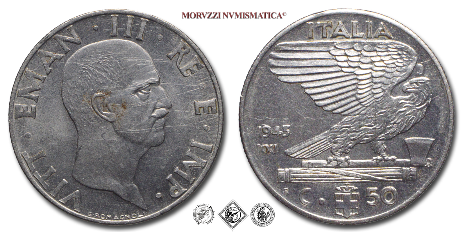 Regno d'Italia, VITTORIO EMANUELE III, 1900-1943, CENTESIMI 50, Impero, Emissione: 1943 XXI, D/ VITT • EMAN • III • RE • E • IMP •, testa nuda del Re a d.; in basso, lungo il bordo: G • ROMAGNOLI, R/ vista laterale di un'aquila con ali spiegate che ghermisce un fascio; sopra: ITALIA; nel campo, a s: millesimo (1943) e anno dell'Era Fascista (XXI); in basso: stemma sabaudo tra il valore (C • 50) con a s. il segno di zecca (R), Zecca di Roma, Rif. bibl. Pagani, 826; Metallo: AC, gr. 5,93, (MI152992), Diam.: mm. 24,13, mSPL, (R)
