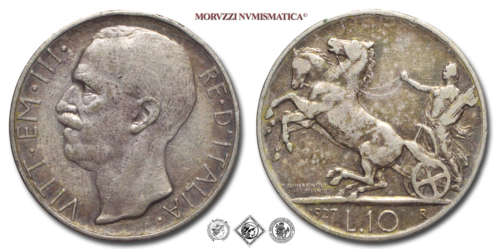 Regno d'Italia, VITTORIO EMANUELE III, 1900-1943, LIRE 10, Biga - due rosette, Emissione: 1927, D/ VITT • EM • III • RE • D'ITALIA •, testa nuda del Re a sinistra, R/ figura allegorica dell'Italia volta a s., su biga, nella mano sinistra stringe un fascio littorio e con la destra le redini; Sotto ai cavalli i nomi dell'incisore (MOTTI INC •) e dell'autore (G • ROMAGNOLI). In esergo il valore (L • 10) tra la data (1927) e il segno di zecca (R), Zecca di Roma, Rif. bibl. Pagani, 692a; Metallo: AR, 9,95, (MI148218), Diam.: mm. 27,00, BB