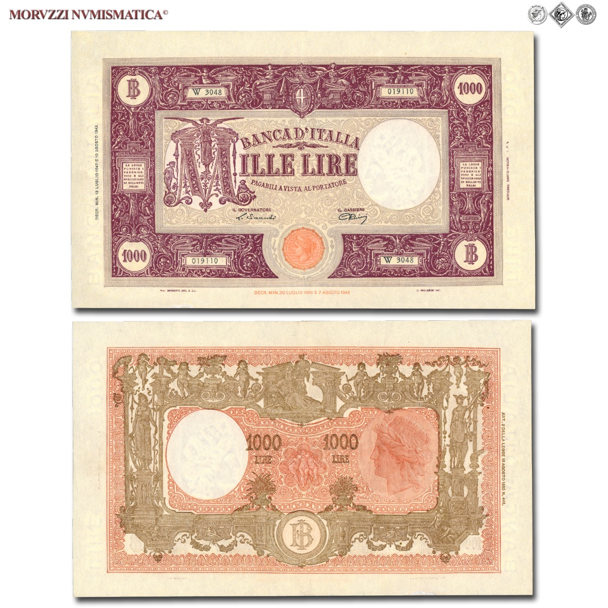 Italia, REPUBBLICA, BANCA D'ITALIA, 1000 LIRE, grande M - Barbetti modificato, 12.07.1947, D/ In alto stemma sabaudo coronato e sorretto da due figure alate, nella sinistra grande "M" con putti e figura alata, R/ In alto uomo con barba, rappresentante il Credito, che regge una cornucopia, nella sinistra allegoria dell'Industria, nella destra figura rappresentante il Commercio; nell'ovale destro testa dell'Italia turitta, Rif. bibl. Crapanzano, 462; (CM150895), Firme: Einaudi, Urbini, n° di serie: W3048 019110, mSPL