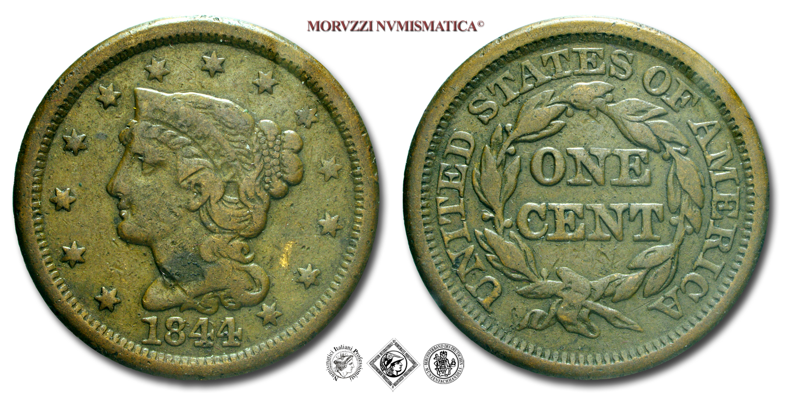 Stati Uniti d'America, CENTESIMO, Braided Hair Cent, 1844, Zecca di Philadelphia, RAME, BB, (KM 67) / USA - United States of America (WORLD COPPER COINS - monete mondiali americane moderne - moneta mondiale americana moderna)