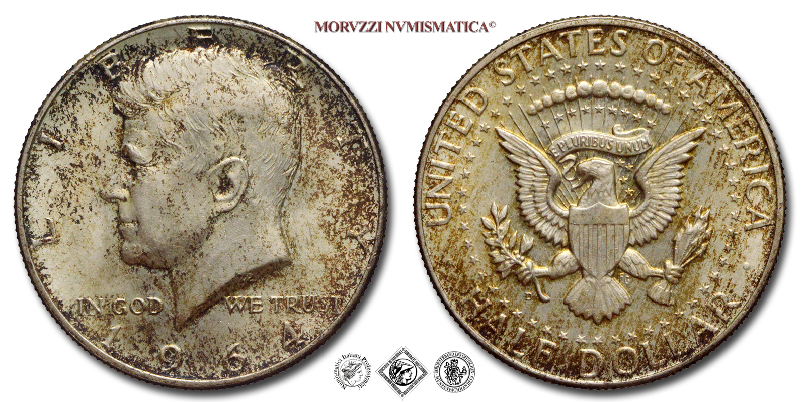 Stati Uniti d'America, DOLLARO 1/2, Kennedy, Emissione: 1964, D/ LIBERTY, Ritratto di John F. Kennedy a sinistra; nel campo, ai lati: IN GOD WE TRUST; sul troncamento del collo: la sigla dell'incisore (GR per Gilroy Roberts); in basso: data (1964), R/ UNITED STATES OF AMERICA, Sigillo presidenziale modificato degli Stati Uniti d'America: uno scudo (con strisce verticali) sul petto di un'aquila americana. L'aquila regge con l'artiglio destro un ramoscello d'ulivo e con quello sinistro un fascio di tredici frecce e nel becco un cartiglio con la scritta "E PLURIBUS UNUM". Un cerchio di stelle circonda l'aquila; nel campo: la sigla dell'incisore (FG per Frank Gasparro); in basso: il valore (HALF DOLLAR), Zecca di Philadelphia, Rif. bibl. KM, 202; Metallo: AR, gr. 12,56, (ME161938), Diam.: mm. 30,53, FDC