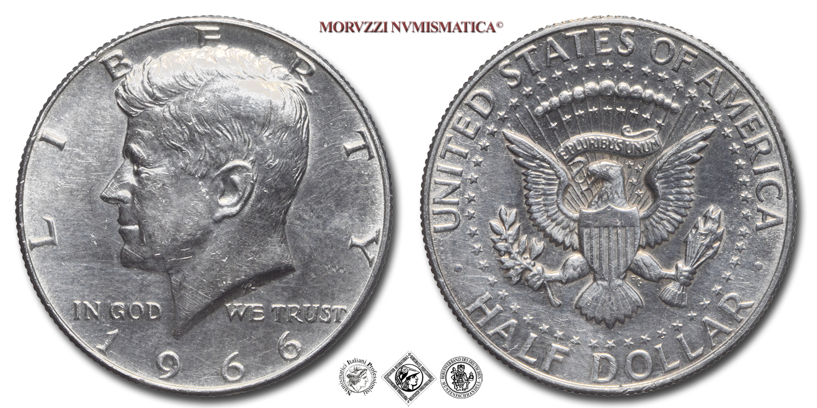 Stati Uniti d'America, DOLLARO 1/2, Kennedy, Emissione: 1966, D/ LIBERTY, Ritratto di John F. Kennedy a sinistra; nel campo, ai lati: IN GOD WE TRUST; sul troncamento del collo: la sigla dell'incisore (GR per Gilroy Roberts); in basso: data (1966), R/ UNITED STATES OF AMERICA, Sigillo presidenziale modificato degli Stati Uniti d'America: uno scudo (con strisce verticali) sul petto di un'aquila americana. L'aquila regge con l'artiglio destro un ramoscello d'ulivo e con quello sinistro un fascio di tredici frecce e nel becco un cartiglio con la scritta "E PLURIBUS UNUM". Un cerchio di stelle circonda l'aquila; nel campo: la sigla dell'incisore (FG per Frank Gasparro); in basso: il valore (HALF DOLLAR), Zecca di Philadelphia, Rif. bibl. KM, 202a; Metallo: AR, gr. 11,45, (ME160871), Diam.: mm. 30,65, mSPL