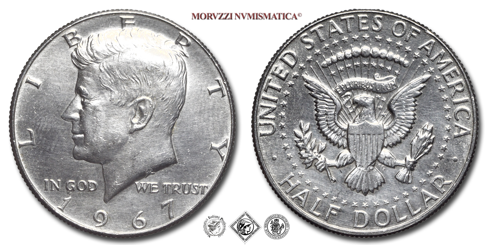 Stati Uniti d'America, DOLLARO 1/2, Kennedy, Emissione: 1967, D/ LIBERTY, Ritratto di John F. Kennedy a sinistra; nel campo, ai lati: IN GOD WE TRUST; sul troncamento del collo: la sigla dell'incisore (GR per Gilroy Roberts); in basso: data (1967), R/ UNITED STATES OF AMERICA, Sigillo presidenziale modificato degli Stati Uniti d'America: uno scudo (con strisce verticali) sul petto di un'aquila americana. L'aquila regge con l'artiglio destro un ramoscello d'ulivo e con quello sinistro un fascio di tredici frecce e nel becco un cartiglio con la scritta "E PLURIBUS UNUM". Un cerchio di stelle circonda l'aquila; nel campo: la sigla dell'incisore (FG per Frank Gasparro); in basso: il valore (HALF DOLLAR), Zecca di Philadelphia, Rif. bibl. KM, 202a; Metallo: AR, gr. 11,26, (ME160872), Diam.: mm. 30,66, FDC
