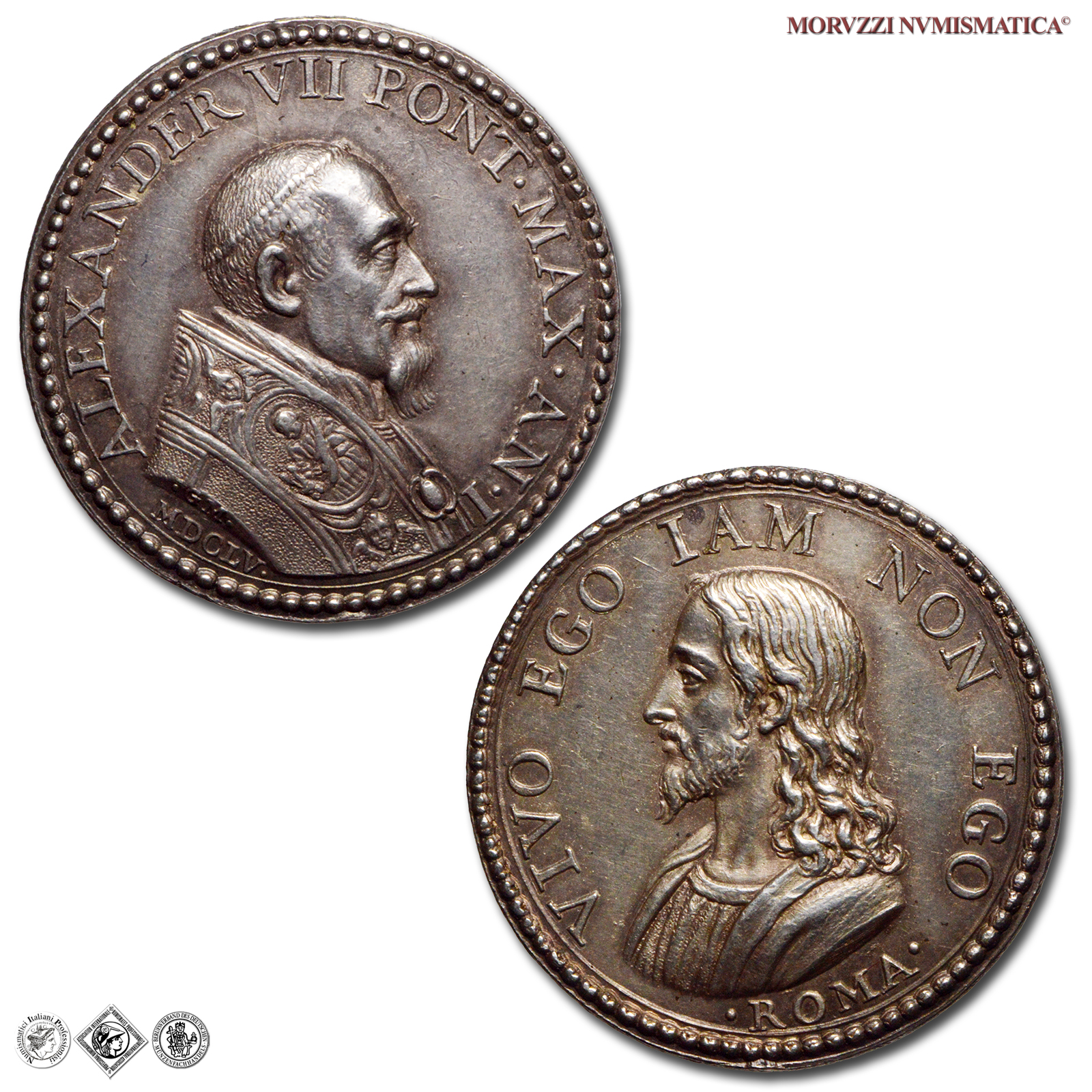 Stato Pontificio, ALESSANDRO VII, Chigi, 1665-1667, MEDAGLIA, Possesso del Laterano, Emissione: 1655 AN I, D/ ALEXANDER VII PONT MAX AN I, busto a d. con piviale; sul taglio spalla: • GM •; sotto: MDCLV •, R/ VIVO EGO IAM NON EGO, busto di Gesú a s.; in alto in cartiglio: ALEXAN • VII • PONT • MAX • / FAMIL • PONTIF • COMMOD • / F • PALAT • QVIRIN • ARNAM / AN • SAL • MDCLIX •; sotto: • ROMA •, Opus Gaspare Morone, Rif. bibl. Miselli, 526; Metallo: AR, gr. 14,56, (MP160417), Diam.: mm. 30,69, SPL, (R)