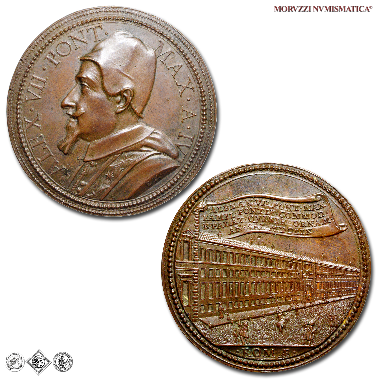 Stato Pontificio, ALESSANDRO VII, Chigi, 1665-1667, MEDAGLIA, Nuova ala Palazzo del Quirinale, Emissione: 1659 A IV, D/ ALEX • VII • PONT • _ MAX • A • IV •, busto con camauro, mozzetta e stola a s.; sul taglio spalla: G M •, R/ Vista della nuova ala del Palazzo del Quirinale; in alto in cartiglio: ALEXAN • VII • PONT • MAX • / FAMIL • PONTIF • COMMOD • / F • PALAT • QVIRIN • ARNAM / AN • SAL • MDCLIX •; in esergo: • ROMAE •, Opus Gaspare Morone, Rif. bibl. Miselli, 565; Patrignani, IV / 1; Metallo: AE, gr. 20,98, (MP160418), Diam.: mm. 39,39, mSPL