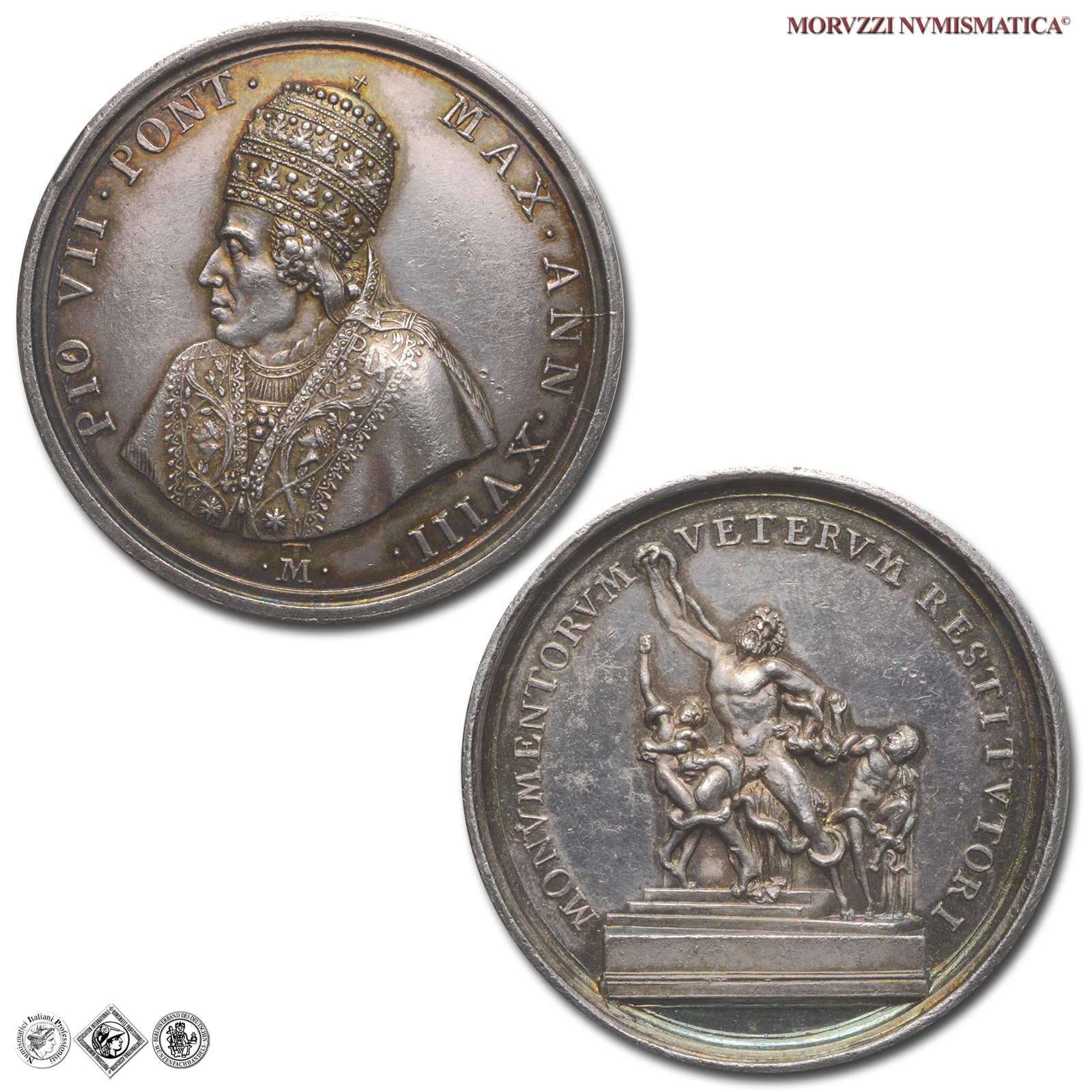 Stato Pontificio, PIO VII, Chiaramonti, 1800-1823, MEDAGLIA, Restituzione opere d'arte dalla Francia, Emissione: 1817, D/ PIO VII • PONT • _ MAX • ANN • XVIII •, busto con triregno e piviale a s.; sotto: • T M • (monogramma), R/ MONVMENTORVM _ VETERVM RESTITVITORI, il Gruppo scultoreo del Laocoonte, Opus Tommaso Mercandetti, Rif. bibl. Bart., E817; Metallo: AR, gr. 32,63, (MP76896), Diam.: mm. 42,98, SPL