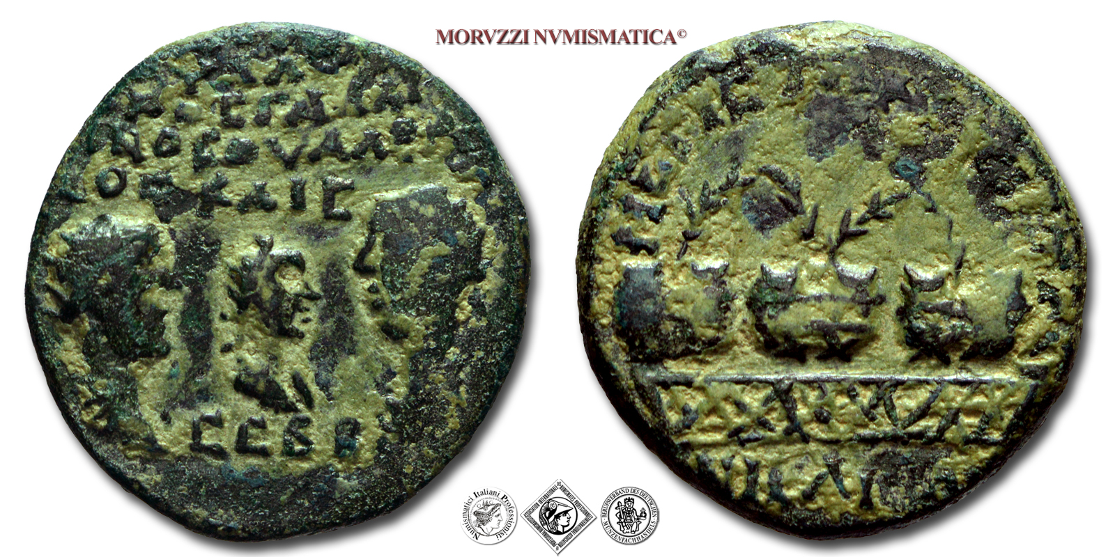 Impero Romano, Bitinia, VALERIANO I, 253-260 d.C., BRONZO, Emissione: 253-260 d.C., D/ AYT OYAΛEPIANOC ΓAΛΛIHNOC OYAΛEPIANOC KAI CEBB, busti affrontati di Valeriano I e Gallieno, tra i due il piccolo busto di Valeriano II, R/ MEΓICTΩN APICTΩN, tavola con 3 coppe premio, all'interno delle quali vi sono rami di palma; in esergo: NIKAIEΩN, Zecca di Nicea, Rif. bibl. SNG Dan., 537; SNG Hunterian, 1140; Metallo: AE, gr. 9,54, (MR26884), Diam.: mm. 23,71, BB, (RR)