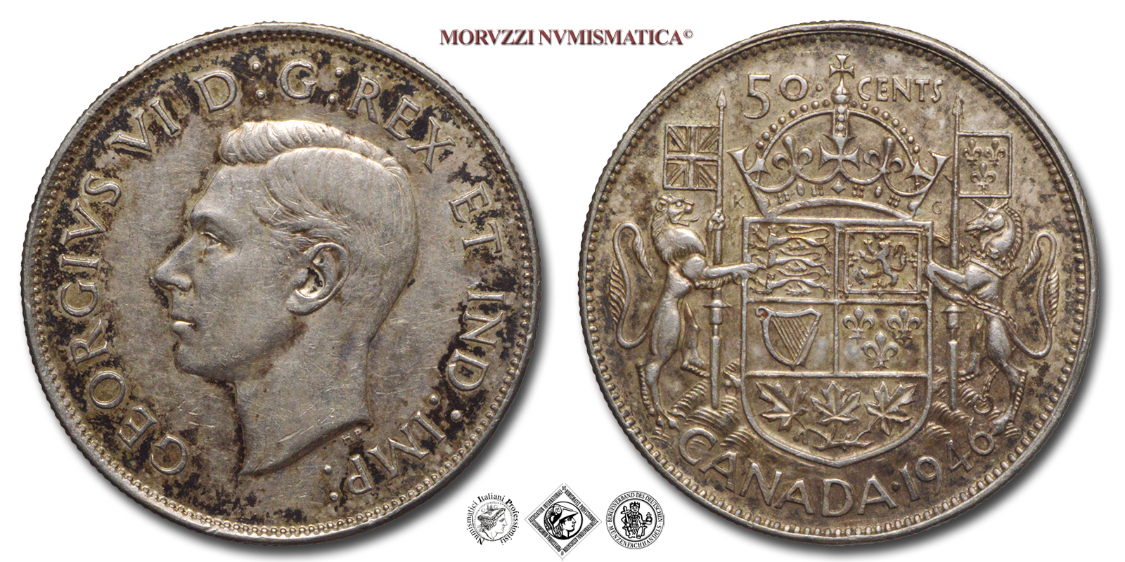 Canada, GIORGIO VI, 1936-1952, CENTESIMI 50, Emissione: 1946, D/ GEORGIVS VI D:G:REX ET IND:IMP:, testa nuda di Re Giorgio VI rivolta a sinistra; sotto il troncamento del collo: iniziali dell'incisore (HP per Thomas Humphrey Paget), R/ 50 CENTS CANADA·1946 K G, versione semplificata dello stemma reale del Canada, proclamato da re Giorgio V il 21 novembre 1921. Incisore: George Kruger Gray, Royal Canadian Mint of Ottawa, Rif. bibl. KM, 36; Metallo: AR, gr. 11,64, (ME148222), Diam.: mm. 29,68, SPL