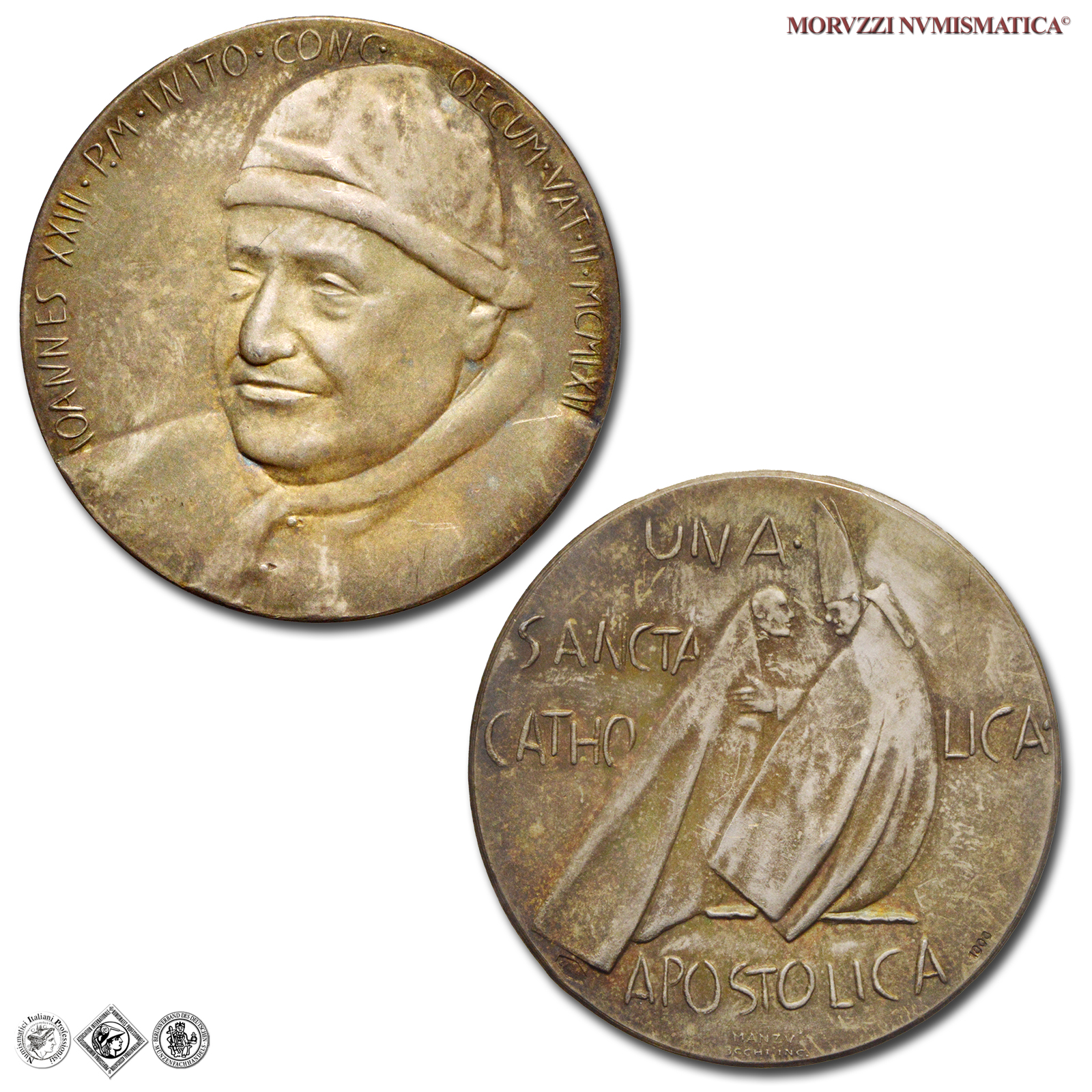 Città del Vaticano, GIOVANNI XXIII, Roncalli, 1958-1963, MEDAGLIA, Convocazione del Concilio Vaticano II, Emissione: 1962, D/ IOANNES XXIII • P.M • INITO • CONC • _ OECUM • VAT • II • MCMLXII, busto di 3/4 a s. con camauro e mozzetta d'ermellino, R/ il Papa in piedi verso s. con mitra e mantello, riceve l'omaggio di un Padre Conciliare; nel campo, su quattro righe: UNA • / SANCTA / CATHO _ LICA • / APOSTOLICA; sotto, su due righe: MANZU' / 3CCHI INC., Opus Giacomo Manzú, Rif. bibl. Modesti, 150; De Luca, 305; Metallo: AR, gr. 14,79, (MP146966), Diam.: mm. 34,91, FDC, (NC)