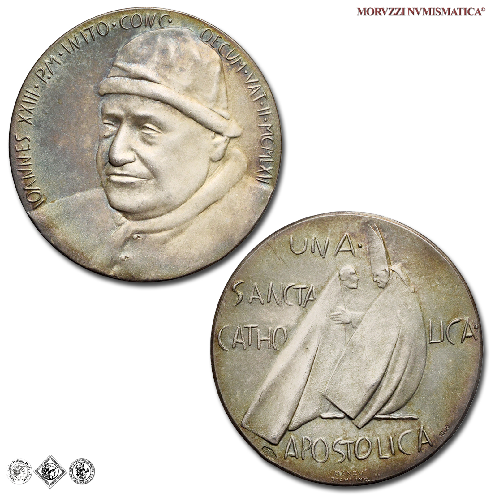Città del Vaticano, GIOVANNI XXIII, Roncalli, 1958-1963, MEDAGLIA, Convocazione del Concilio Vaticano II, Emissione: 1962, D/ IOANNES XXIII • P.M • INITO • CONC • _ OECUM • VAT • II • MCMLXII, busto di 3/4 a s. con camauro e mozzetta d'ermellino, R/ il Papa in piedi verso s. con mitra e mantello, riceve l'omaggio di un Padre Conciliare; nel campo, su quattro righe: UNA • / SANCTA / CATHO _ LICA • / APOSTOLICA; sotto, su due righe: MANZU' / 3CCHI INC., Opus Giacomo Manzú, Rif. bibl. Modesti, 150; De Luca, 305; Metallo: AR, gr. 15,19, (MP146967), Diam.: mm. 34,90, FDC, (NC)