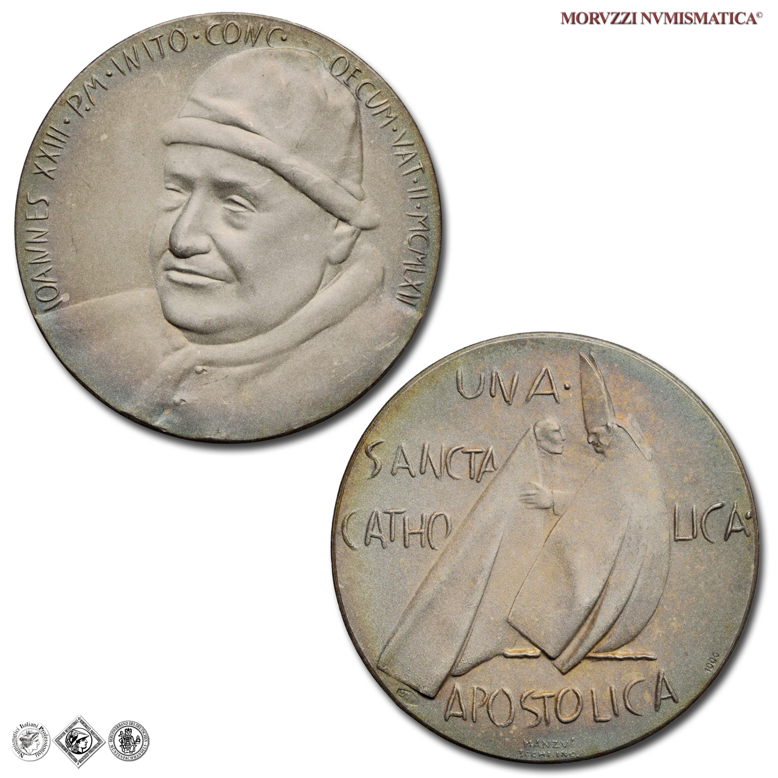 Città del Vaticano, GIOVANNI XXIII, Roncalli, 1958-1963, MEDAGLIA, Convocazione del Concilio Vaticano II, Emissione: 1962, D/ IOANNES XXIII • P.M • INITO • CONC • _ OECUM • VAT • II • MCMLXII, busto di 3/4 a s. con camauro e mozzetta d'ermellino, R/ il Papa in piedi verso s. con mitra e mantello, riceve l'omaggio di un Padre Conciliare; nel campo, su quattro righe: UNA • / SANCTA / CATHO _ LICA • / APOSTOLICA; sotto, su due righe: MANZU' / 3CCHI INC., Opus Giacomo Manzú, Rif. bibl. Modesti, 150; De Luca, 305; Metallo: AR, gr. 15,01, (MP146968), Diam.: mm. 34,96, FDC, (NC)