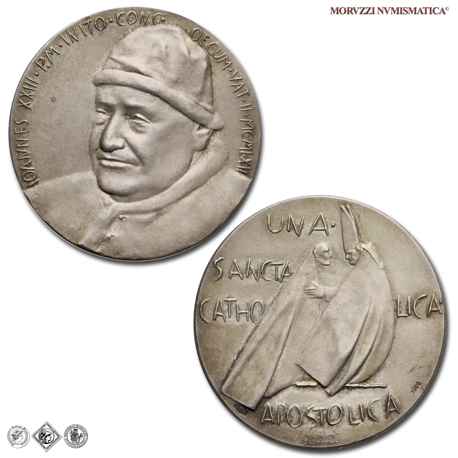 Città del Vaticano, GIOVANNI XXIII, Roncalli, 1958-1963, MEDAGLIA, Convocazione del Concilio Vaticano II, Emissione: 1962, D/ IOANNES XXIII • P.M • INITO • CONC • _ OECUM • VAT • II • MCMLXII, busto di 3/4 a s. con camauro e mozzetta d'ermellino, R/ il Papa in piedi verso s. con mitra e mantello, riceve l'omaggio di un Padre Conciliare; nel campo, su quattro righe: UNA • / SANCTA / CATHO _ LICA • / APOSTOLICA; sotto, su due righe: MANZU' / 3CCHI INC., Opus Giacomo Manzú, Rif. bibl. Modesti, 150; De Luca, 305; Metallo: AR, gr. 14,47, (MP146971), Diam.: mm. 34,91, FDC, (NC)