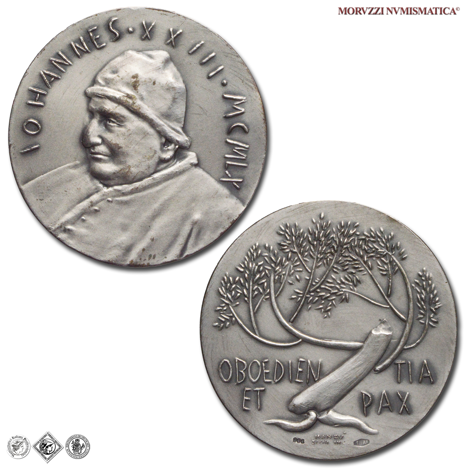 Città del Vaticano, GIOVANNI XXIII, Roncalli, 1958-1963, MEDAGLIA, Olimpiadi di Roma, Emissione: 1960, D/ IOHANNES • XXIII • MCMLX, busto a s. con camauro e mozzetta, R/ Pianta d'ulivo; nel campo: OBOEDIEN _ TIA / ET _ PAX; sotto: MANZU' / 3CCHI INC., Opus Giacomo Manzú, Rif. bibl. Modesti, 109; De Luca, 290; Metallo: AR, gr. 14,10, (MX146975), Diam.: mm. 33,10, FDC