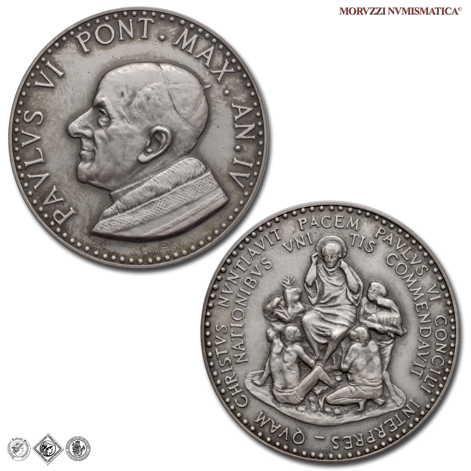 Città del Vaticano, PAOLO VI, Montini, 1963-1978, MEDAGLIA, Il Pontefice all'assemblea delle Nazioni Unite, Emissione: 1966 AN. IV, D/ PAVLVS VI PONT. MAX. AN. IV, busto con berrettino, mozzetta e stola a sinistra; sotto: MINGUZZI, R/ QVAM CHRISTVS NVNTIAVIT PACEM PAVLVS VI CONCILII INTERPRES - / NATIONIBVS VNITIS COMMENDAVIT, la predicazione di Cristo, Opus Luciano Minguzzi, Rif. bibl. Bart.,E966; Modesti, 434; Metallo: AR, gr. 39,45, (MP159823), Diam.: mm. 44,05, FDC