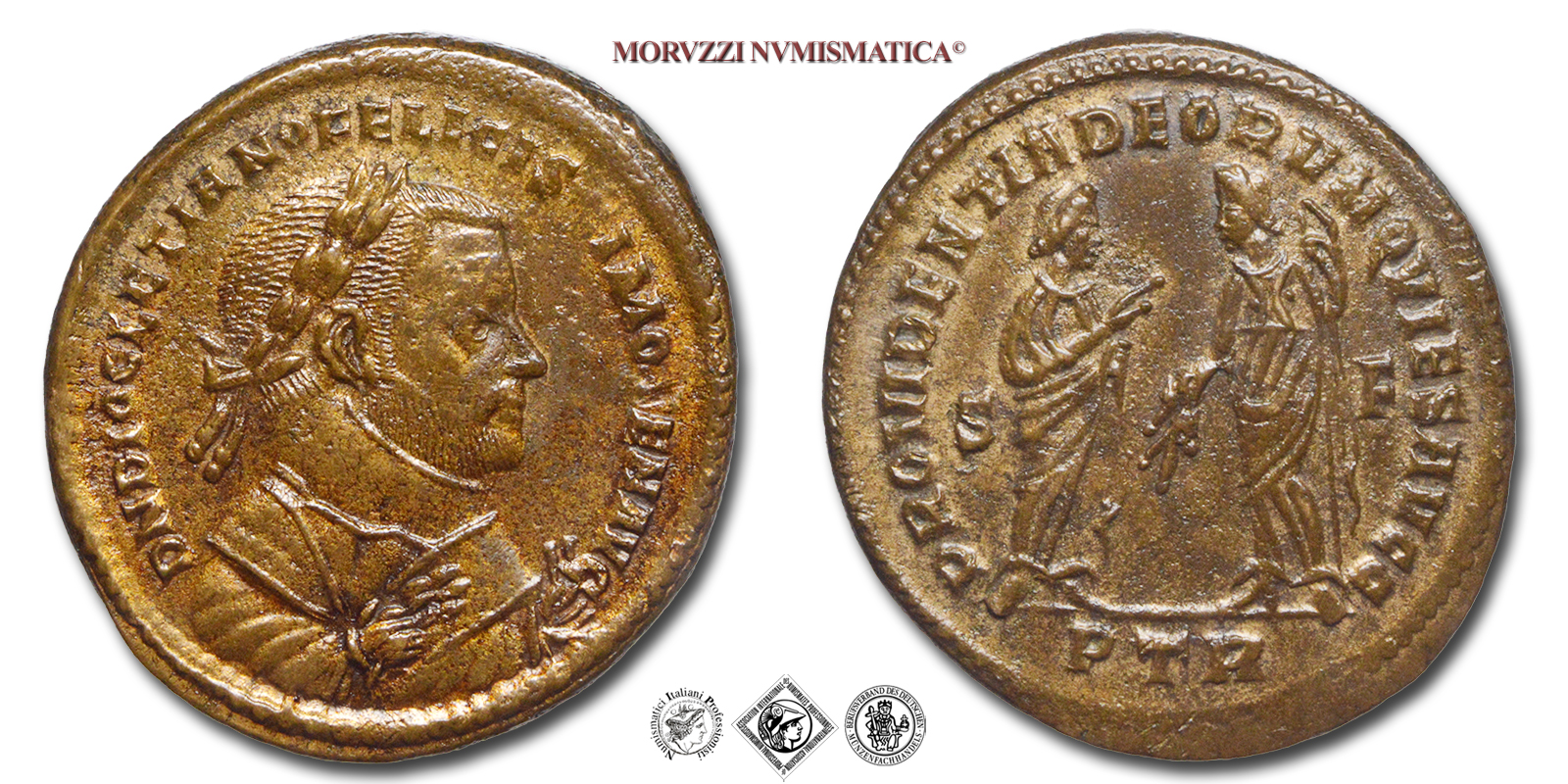 DIOCLEZIANO, FOLLIS, 305-307 d.C., PROVIDENTIA DEORVM QVIES AVGG / PTR / S F la Providentia stende in avanti la destra alla Quiete che le sta dinanzi, Zecca di Treviri, BRONZO, SPL, (RIC 676a) / monete romane imperiali antiche (moneta romana imperiale antica della Tetrarchia - Impero Romano)