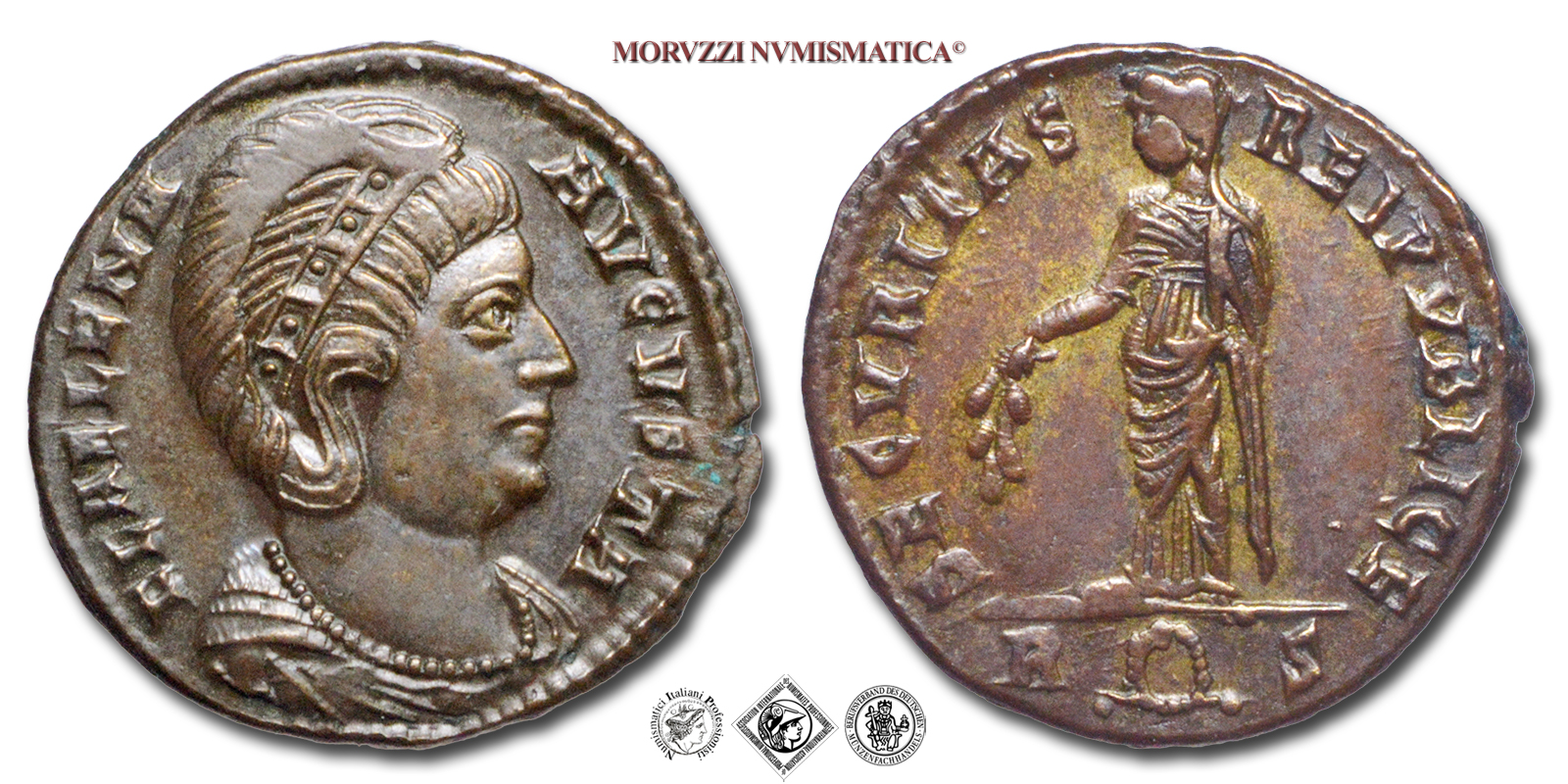 Impero Romano, ELENA, Madre di Costantino, 307-337 d.C., PICCOLO BRONZO, Emissione: 327-328 d.C., D/ FL HELENA AVGVSTA, busto diademato e ammantato a destra, R/ SECVRITAS REIPVBLICAE, R corona S, la Securitas stante a sinistra con ramoscello nella destra, Zecca di Roma, Rif. bibl. R.I.C., 291/R; Cohen, 12; Metallo: AE, gr. 3,28, (MR160593), Diam.: mm. 16,29, SPL, (RR)
