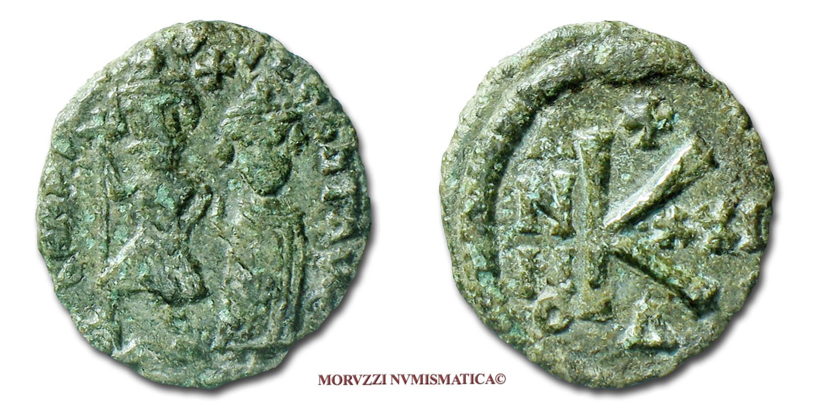 ERACLIO con ERACLIO COSTANTINO, 630-631 d.C., FOLLIS, Emissione: 613-641 d.C., Zecca di Ravenna, Rif. bibl. Sear, 922; D.O., 300-01; Hann, 261; Metallo: AE, gr. 4,07, (MB126374), Diam.: mm. 19,23, SPL, (RR)