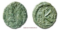 Impero Bizantino, ERACLIO, 613-641 d.C., FOLLIS, Emissione: 613-641 d.C., D/ dd NN hERACLIVS ET hERA CONST PP AV, Eraclio ed Eraclio Costantino con corona e globo crucigero in piedi frontalmente, croce in alto, R/ grande M tra A/N/N/O e II/I. Sopra: cristogramma. Sotto: monogramma (Δ), Zecca di Costantinopoli, Rif. bibl. Sear, 805; Metallo: AE, gr. 9,30, (MB154204), Diam.: mm. 27,93, mBB, (NC)