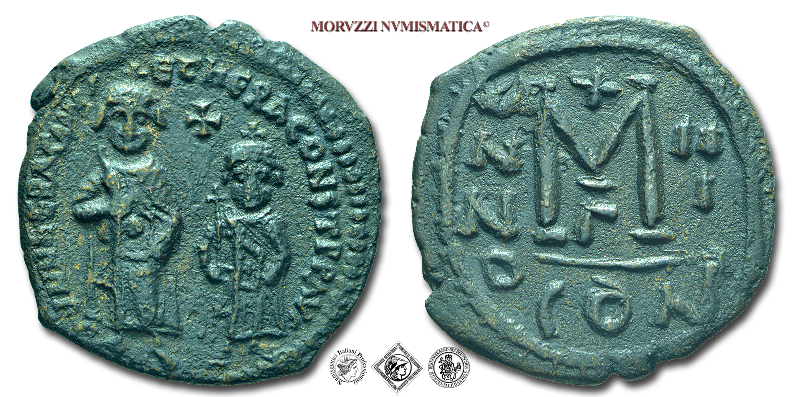 ERACLIO, FOLLIS, 613-641 d.C., dd NN hERACLIVS ET hERA CONST PP AV Eraclio ed Eraclio Costantino con corona e globo crucigero e croce in alto / grande M tra monogramma A/N/N/O e II/I, Zecca di Costantinopoli, BRONZO, mBB, (NC), (Sear 805) / monete